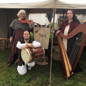 Für den Markt in Hengsterholz bei Ganderkesee haben wir mit Vera Menzen (welche hin und wieder als Gastmusikerin mit Geige, Flöten und Gesang mit uns auftreten wird) ein komplett neues Programm zusammengestellt. Da Vera viele Jahre mit Fogelvrei als Clownesse Antonja unterwegs war, lag es nahe, ihr Showtalent mit einzubauen und so entstand die Holzpuppe „Piet“, welche unser Programm mit Entertainment bereichert. Samstag regnete es immer wieder, aber wir bekamen Obdach in einem Lager mit großem Dach. Leider konnten wir wegen der Witterung Anjas Harfe nicht verstärken, was unsere musischen Möglichkeiten etwas einschränkte. Ausserdem schlug das Wetter den Instrumenten auf die Stimmung – weil sie sich vollsogen wie ein Spielmann an der Taverne. Sonntag war besseres Wetter und wir konnten unter freiem Himmel auftreten.